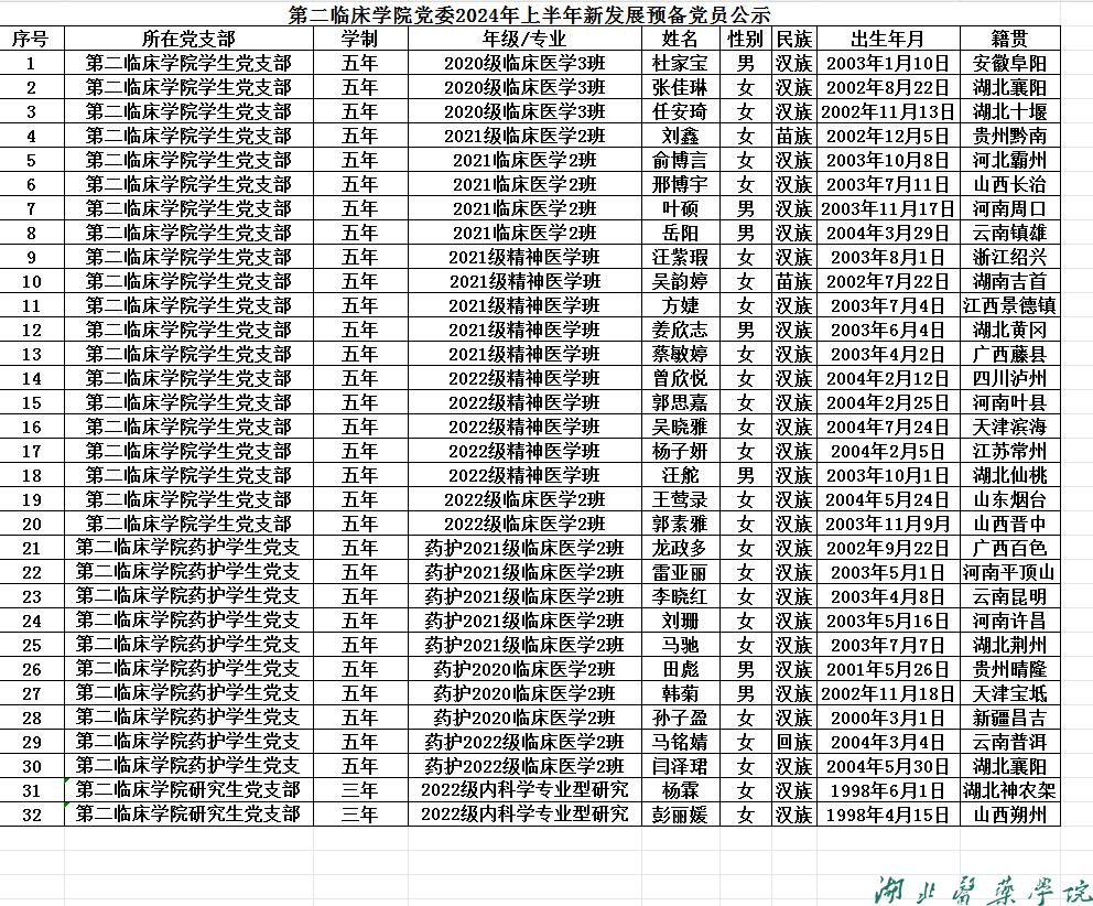 根据《中国共产党发展党员工作细则》,严格按照发展党员各项程序,经学生党支部审查和学院党委预审,拟发展杜家宝等32名同志为中共预备党员。为加强对发展党员工作的民主监督,增强工作透明度,按照学校党委发展党员工作制度有关规定,现公示如下: