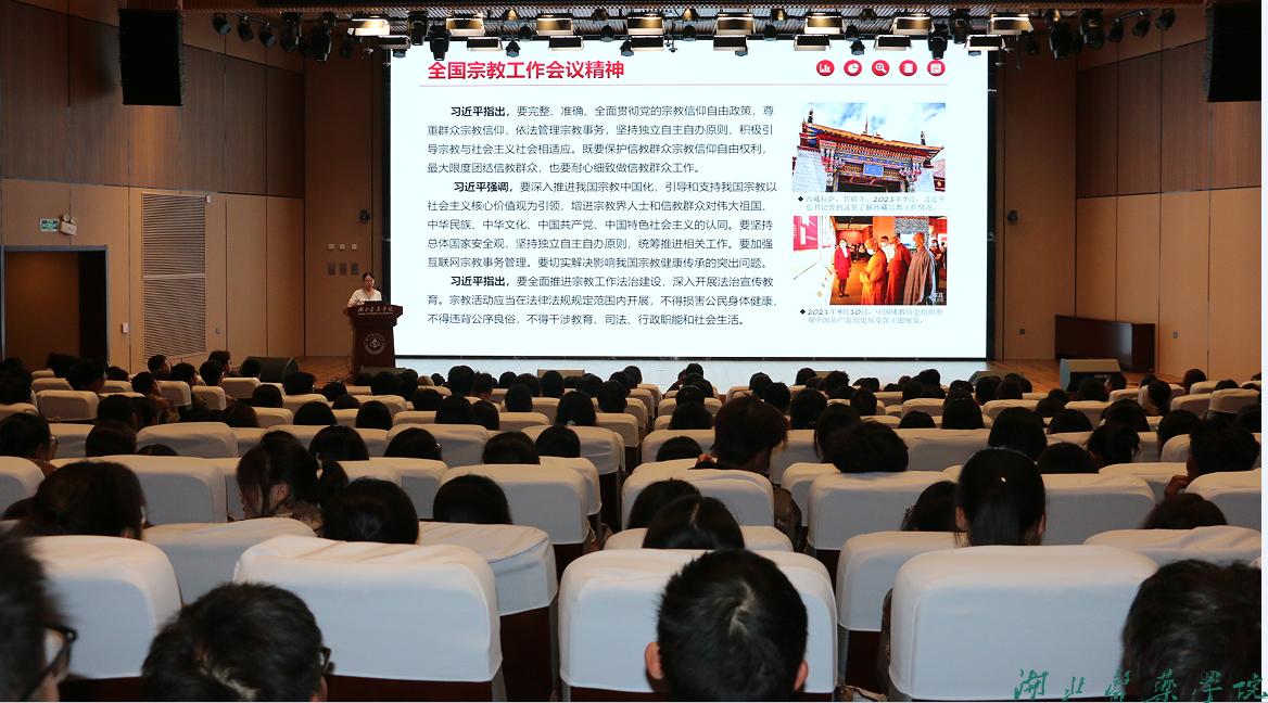 李占秋以“树立正确宗教观、抵制宗教渗透校园”为主题,向同学们解读了全国宗教工作会议精神、宗教法律法规及政策,讲述了何为宗教、如何看待宗教关系现状,引导同学们正确认识宗教对校园的渗透,明确提出要对校园传教说“不”。