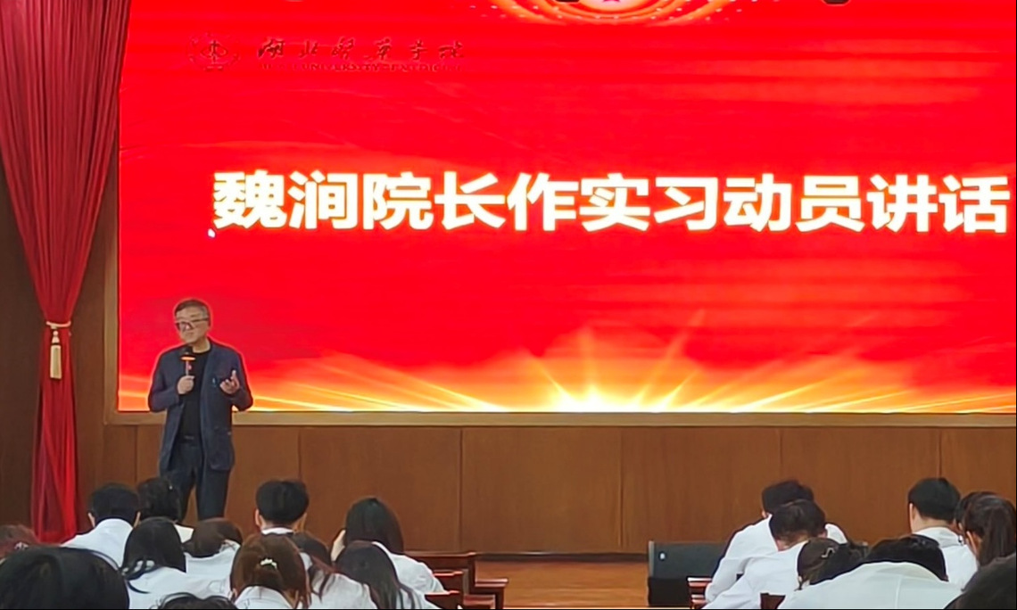 本网讯(通讯员尚静)为明确实习目标、强化安全意识、助力医学生顺利完成从理论学习到临床实践的角色转变,4月16日下午,beat365官网在国药东风总医院科教科报告厅隆重召开2026年实习动员大会。学院院长魏涧、学院党委副书记陈立、教学办、学工办老师及全体2026级实习生参加会议,会议由陈立主持。